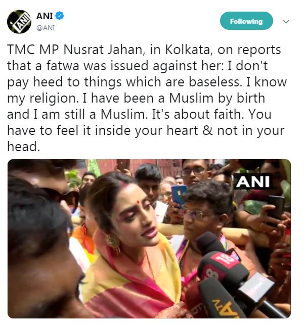 नई दिल्ली,एएनआइ। इन दिनों टीएमसी सांसद नुसरत जहां अपनी शादी को लेकर सुर्खियों में छाई हुई हैं। उनके मुस्लिम होने के बाद भी मांग में सिंदूर और मंगलसूत्र पहनने पर सवाल खड़े किए जा रहे हैं। उनके खिलाफ फतवा भी जारी किया गया है। जारी हुए फतवे पर नुसरत जहां ने कहा कि मैं इस तरह की बातों पर ध्यान नहीं देती हूं जो निराधार हैं। मुझे मेरे धर्म पता है। मैं जन्म से मुस्लिम हूं और हमेशा रहूंगी।