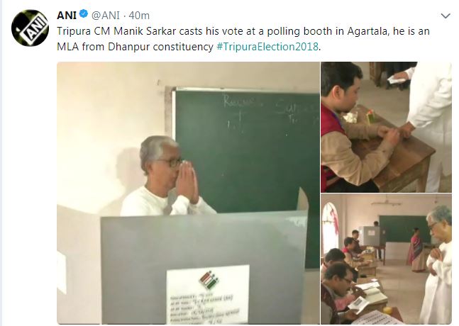 त्रिपुरा के मुख्यमंत्री माणिक सरकार ने अगरतला के पोलिंग बूथ पर वोट डाला। वह धनपुर निर्वाचन क्षेत्र से चुनाव लड़ रहे हैं।