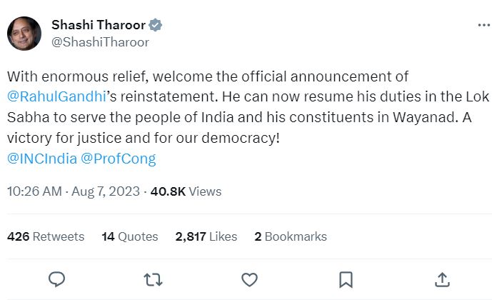 कांग्रेस के वरिष्ठ नेता शशि थरूर ने ट्वीट किया, "बेहद राहत के साथ, मैं राहुल गांधी की बहाली की आधिकारिक घोषणा का स्वागत करता हूं। वह अब भारत के लोगों और वायनाड में अपने मतदाताओं की सेवा करने के लिए लोकसभा में अपने कर्तव्यों को फिर से शुरू कर सकते हैं। यह लोकतंत्र और न्याय की जीत है!''