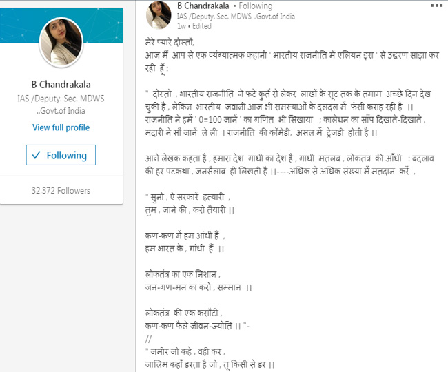 लोगों का मानना है कि चंद्रकला के नाम से बने लिंक्डइन अकाउंट पर पोस्ट के जरिए मौजूदा राजनीतिक स्थितियों पर करारा प्रहार करने का प्रयास किया जा रहा है। पढ़ें, करीब तीन सप्ताह पहले इसी लिंक्डइन अकाउंट से किया गया पोस्ट...