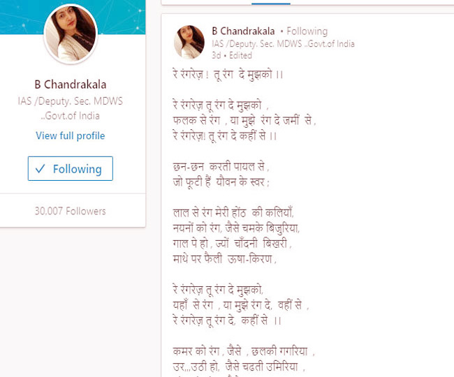 सीबीआई ने अवैध खनन मामले में IAS बी.चंद्रकला के लखनऊ स्थित आवास पर पांच जनवरी 2019 को छापा मारा था। इसके साथ ही यूपी की ये धाकड़ अधिकारी पहली बार नकारात्मक वजहों से सुर्खियों में आयी थी। छापे के कुछ दिन बाद ही उनके नाम से बने इस लिंक्डइन प्रोफाइल से पहली बार ‘जीवन के रंग को क्यों फीका किया जाए’ नाम से एक कविता पोस्ट की गई थी। इस पोस्ट में लिखा था...