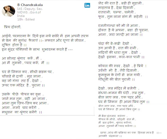 करीब तीन सप्ताह पहले भी बी चंद्रकला के नाम से बने इसी लिंक्डइन अकाउंट पर ‘जानेमन, तुम छिप-छिप कर आना’ शीर्षक से एक कविता पोस्ट की गई थी। कविता के अंत में लिखा था कि छापा जांच की प्रक्रिया का एक हिस्सा मात्र है।