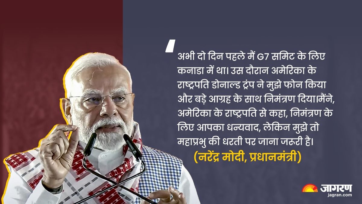 ओडिशा में कार्यक्रम को संबोधित करते हुए प्रधानमंत्री नरेंद्र मोदी ने कहा कि अभी दो दिन पहले मैं G7 समिट के लिए कनाडा में था। उस दौरान अमेरिका के राष्ट्रपति डोनाल्ड ट्रंप ने मुझे फोन किया और बड़े आग्रह के साथ निमंत्रण दिया। मैंने, अमेरिका के राष्ट्रपति से कहा, निमंत्रण के लिए आपका धन्यवाद, लेकिन मुझे तो महाप्रभु की धरती पर जाना जरूरी है। इसलिए मैंने उनका निमंत्रण विनम्रता से मना किया। आपका प्रेम मुझे महाप्रभु की धरती तक खींच लाया है।