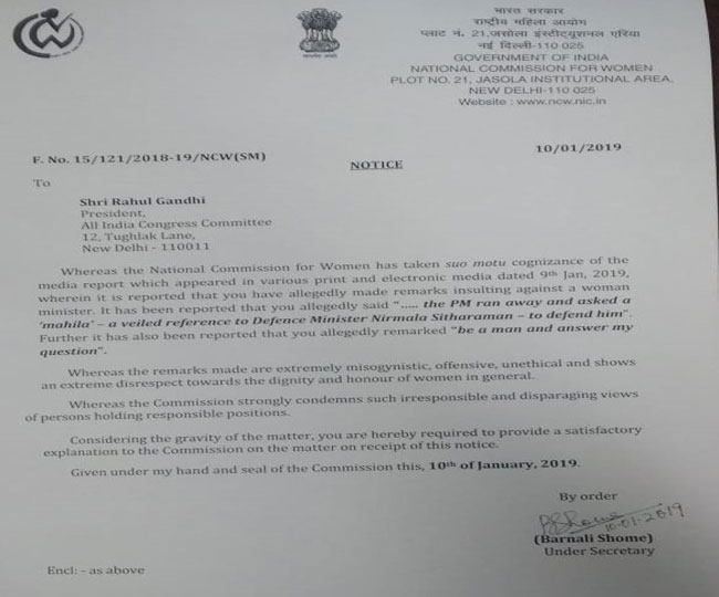 इसको लेकर राष्ट्रीय महिला आयोग ने कांग्रेस अध्यक्ष राहुल गांधी को नोटिस भेजा है। राहुल गांधी को नोटिस जारी करते हुए राष्ट्रीय महिला आयोग ने कहा है, 'उनकी टिप्पणी महिला-विरोधी, आक्रामक, अनैतिक तथा सामान्य रूप से महिलाओं के मान एवं प्रतिष्ठा के विरुद्ध असम्मान ज़ाहिर करती है।'