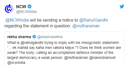 इस बयान की राष्ट्रीय महिला आयोग की अध्यक्ष रेखा शर्मा ने भी कड़ी निंदा की है। उन्होंने ट्वीट कर लिखा, 'राहुल गांधी का बयान- 'एक महिला से कहा मेरी रक्षा कीजिए?' महिला विरोधी है। क्या वह सोचते हैं कि एक महिला कमजोर है? राहुल इतने बड़े लोकतांत्रिक देश की रक्षामंत्री को कमजोर कह रहे हैं।'