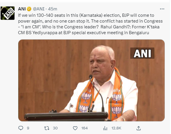 कर्नाटक के पूर्व मुख्यमंत्री बीएस येदियुरप्पा ने यह भी कहा कि कांग्रेस के सांप्रदायिक राजनीति के बल पर सत्ता में आने के दिन गए। उन्होंने कहा, 'विधानसभा चुनाव 10-12 अप्रैल से पहले होने की उम्मीद है। इस चुनाव में 130-140 सीटें जीतकर भाजपा को स्पष्ट बहुमत से सरकार बनाने से कोई नहीं रोक सकता।'