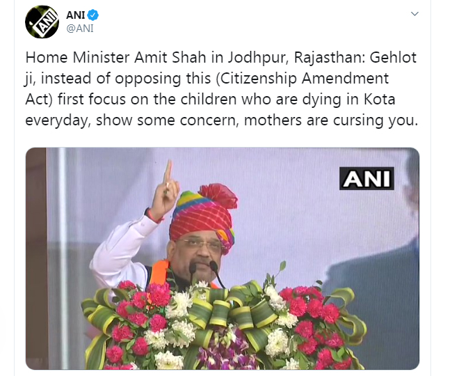 राजस्थान के जोधपुर में गृह मंत्री अमित शाह ने कहा कि गहलोत जी, इस (नागरिकता संशोधन अधिनियम) का विरोध करने के बजाय, जो बच्चे रोज कोटा में मर रहे हैं, उन पर अपना ध्यान केंद्रित करें, कुछ चिंताएं दिखाएं, मांएं आपको कोस रही हैं।