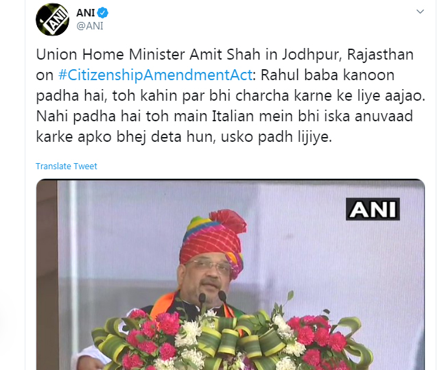 अमित शाह ने कहा कि राहुल बाबा कानून पढ़ा है, तो कहीं पर भी चर्चा करने के लिए आ जाओ। नहीं पढ़ा है तो मैं इटैलियन में इसका अनुवाद करके भेज देता हूं, उसको पढ़ लीजिए।