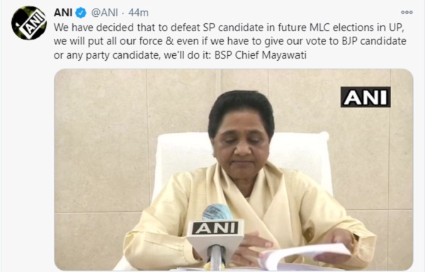 मायावती ने कहा है कि सपा को सबक सिखाने के लिए वो भाजपा को वोट देना पड़ा तो भी पीछे नहीं हटेंगी। एमएलसी के चुनाव में बीएसपी जैसे को तैसा जवाब देने के लिए पूरा जोर लगाएगी। उन्होंने यह भी कहा कि 2003 में अखिलेश के पिता ने भी यही गलत काम किया था, जिसके बाद 2007 में बीएसपी की सरकार बनी। मायावती ने स्पष्ट कहा है कि प्रदेश में आने वाले विधान परिषद के चुनाव में हम समाजवादी पार्टी के प्रत्याशियों को बुरी तरह हराएंगे। इसके लिए हम तो अपनी पूरी ताकत झोंक देंगे। इसके लिए अगर हमें भाजपा या किसी अन्य पार्टी के प्रत्याशी को अपना वोट देना पड़े तो हम वो भी करेंगे।