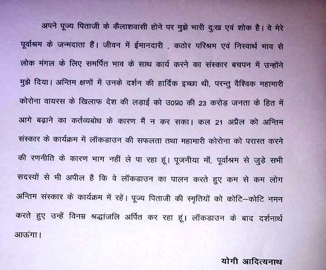 उन्होंने कोरोना वायरस संक्रमण से जंग के लिए अपनी प्रतिबद्धता जताने के साथ ही मां से भावुक अपील की। उन्होंने लिखा है कि लॉकडाउन का पालन करते हुए पिता जी के अंतिम संस्कार में कम से कम लोग शामिल हों।मां को सम्बोधित पत्र में उन्होंने लिखा है कि पिता को श्रद्धांजलि। हम अंतिम संस्कार के कार्यक्रम में भाग नहीं लेंगे। सीएम योगी आदित्यनाथ ने लिखा है कि पिताजी के कैलाशवाली होने पर मुझे भारी दुख और शोक है।