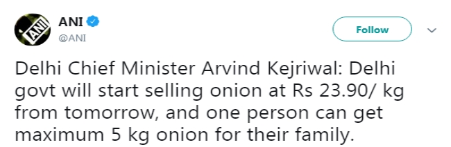 दिल्ली सचिवालय में आयोजित प्रेसवार्ता में केजरीवाल ने कहा एक आदमी एक बार में 5 किलो प्याज खरीद सकेगा। प्याज की बिक्री 400 राशन की दुकानों और 70 मोबाइल वैन से शुरू से की जाएगी। कल से ही लोगों को 23 रुपये 90 पैसे प्रति किलो की दर प्याज मिलना शुरू हो जाएगा।