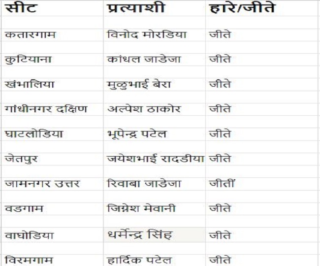 10. वाघोडिया क्षेत्र से जीती भाजपा : गुजरात के वाघोडिया क्षेत्र से निर्दलीय उम्मीदवार धर्मेन्द्र सिंह वाघेला जीते । धर्मेन्द्र सिंह वाघेला को 77,905 वोट मिले हैं। उन्होंने 14006 वोटों से जीत दर्ज की है। दूसरे स्थान पर बीजेपी के अश्विन पटेल रहे। उन्हें 63,899 वोट मिले हैं। इन दोनों के बीच जो 14 हजार वोटों का मार्जिन रहा है।