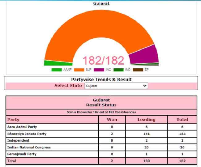 चुनाव आयोग के आधिकारिक रुझानों के मुताबिक भाजपा ने 2 सीटों पर जीत दर्ज़ की है और 151 विधानसभा सीटों पर आगे चल रही है जबकि कांग्रेस 20 सीटों, आम आदमी पार्टी 6 सीटों, निर्दलीय 2 सीटों और सपा 1 सीट पर आगे चल रही है।