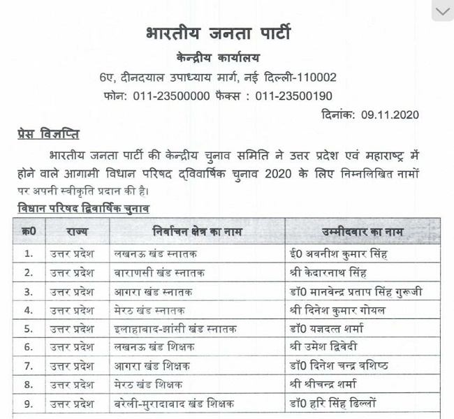 भाजपा के राष्ट्रीय महासचिव तथा केंद्रीय कार्यालय प्रभारी अरुण सिंह ने सोमवार को उत्तर प्रदेश व महाराष्ट्र के स्नातक-शिक्षक एमएलसी चुनाव के प्रत्यशियों के नाम का एलान किया। इसमें उत्तर प्रदेश के नौ और महाराष्ट्र के चार प्रत्याशी हैं। भारतीय जनता पार्टी की केंद्रीय चुनाव समिति ने उत्तर प्रदेश और महाराष्ट्र विधान परिषद के आगामी द्विवार्षिक चुनावों के लिए उम्मीदवारों के नाम जारी किए।
