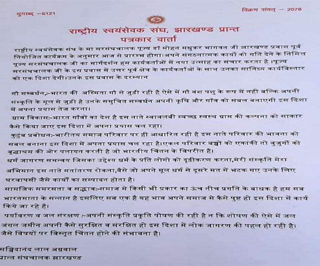 संघ के संगठन समागम में गुरुवार को संघ प्रमुख पूर्व गणवेशधारी स्‍वयंसेवकों को संबोधित करेंगे। इसके बाद झारखंड बिहार के संघ के पदाधिकारियों के साथ उत्‍तर पूर्व क्षेत्र के संघ स्‍वयंसेवकों के साथ विभिन्‍न विषयों पर अलग-अलग बैठक करेंगे। इस बैठक में शाखा विस्‍तार, गांवों के विकास, पर्यावरण बचाने और गो सेवा आदि विषय पर भी बातें हो सकती हैं। माना जा रहा है कि सीएए, एनआरसी, एनपीआर और देश-राज्‍य के ज्‍वलंत मुद्दों पर भी संघ समागम में गहन मंथन हो सकता है।