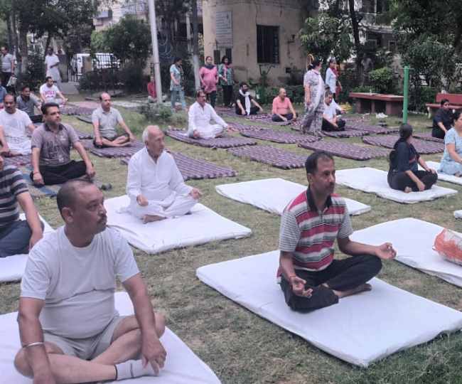 इंटरनेशनल योग दिवस पर रेडिसन एनक्लेव पार्क फ्रेंड्स कॉलोनी में भारतीय विकास परिषद जालंधर गौरव की ओर से आयोजित शिवर में लोगों ने किया योग।