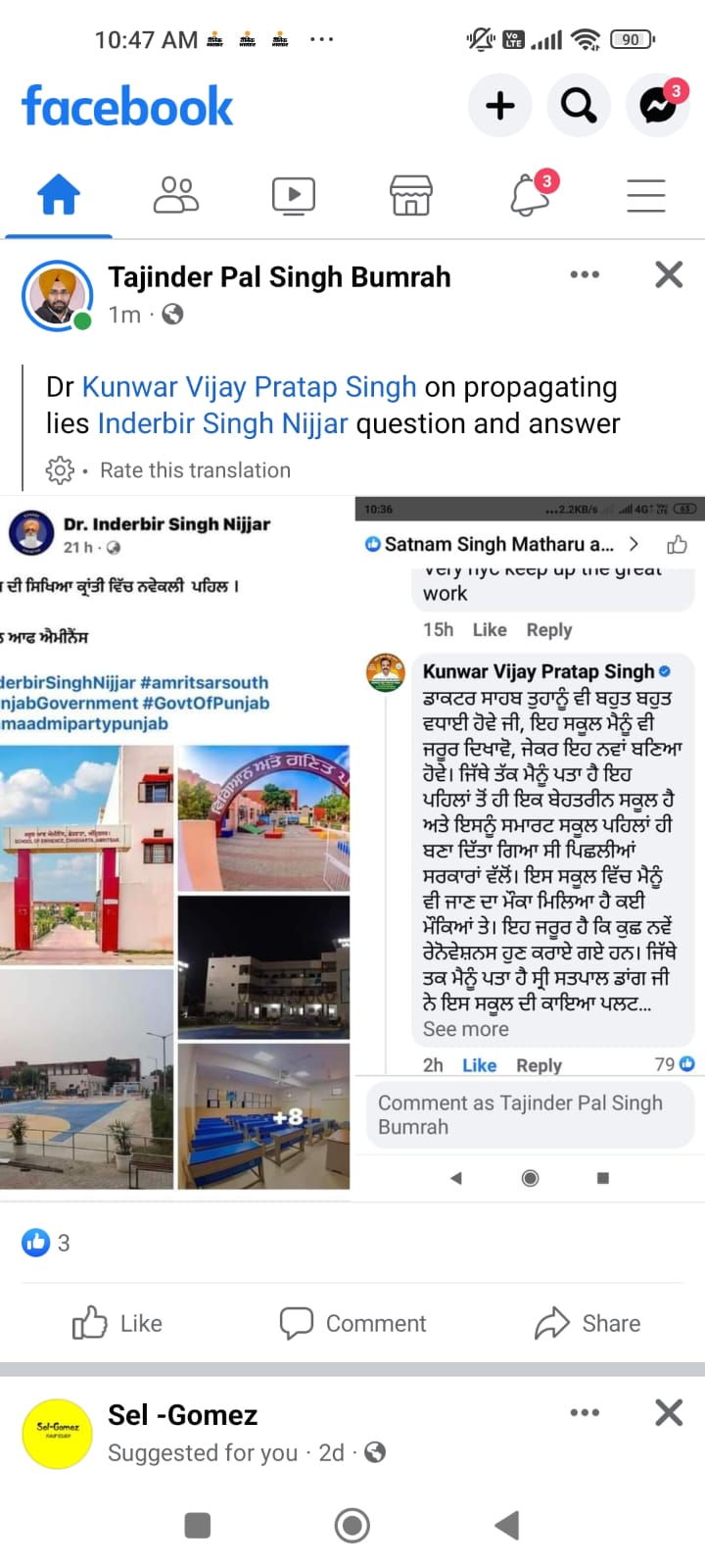 विधायक निज्जर की फेसबुक पोस्ट पर विधायक कुंवर विजय प्रताप सिंह ने कमेंट करते हुए कहा कि अगर स्कूल नया बनाया गया है तो उन्हें जरूर दिखाएं। इस कमेंट के जरिए विधायक कुंवर विजय प्रताप सिंह ने स्कूल ऑफ एमिनेंस (School of Eminence) पर सवाल खड़े किए हैं। इसके साथ ही उन्होंने कहा कि छेहरटा में पहले की सरकार में स्कूल की परफॉर्मेंस अच्छी थी।