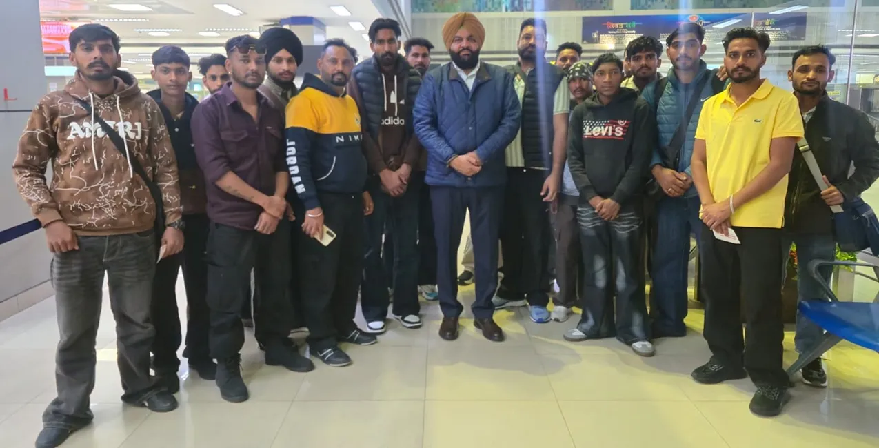 मलेशिया से डिपोर्ट हुए युवाओं के साथ खड़े सांसद गुरजीत औजला।