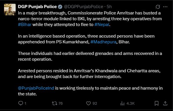 डीजीपी गौरव यादव ने बताया कि उन्हें बिहार के मधेपुर से उस समय पकड़ा गया है। ये आरोपी यहां से नेपाल भागने की योजना बना रहे थे। उन्होंने कहा कि तीनों को आगे की पूछताछ के लिए पंजाब वापस लाया जा रहा है। जांच से पता चला है कि करनदीप यादव ने इस साल जनवरी में तरनतारन से बरामद ग्रेनेड और हथियार पहुंचाए थे।