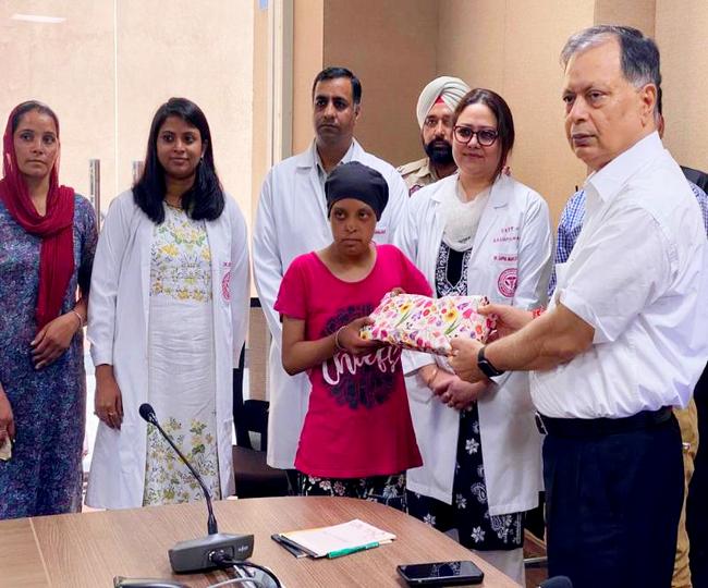बठिंडा एम्स के डायरेक्टर डा. डीके सिंह एक कैंसर मरीज को बालों से तैयार विग देते हुए।