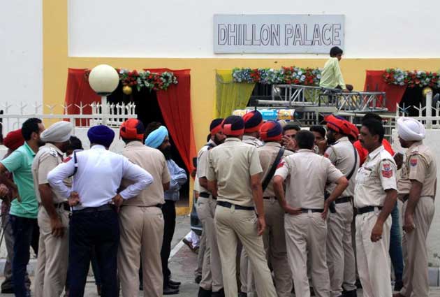 मैरिज पैलेस के बाहर खड़ी पुलिस।