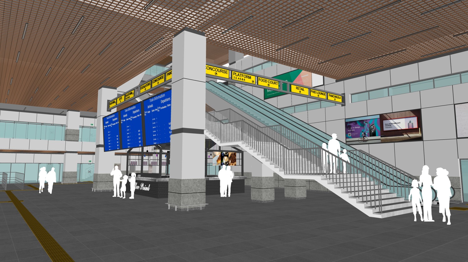 -चंडीगढ़ और पंचकूला की तरफ क्लाक रूम, फूड कोर्ट, खुदरा दुकानें और एक-एक पूछताछ काउंटर।