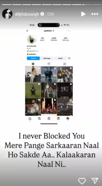 जिसके बाद दिलजीत दोसांझ ने एपी ढिल्लों को जवाब देते हुए अपने आधिकारिक इंस्टाग्राम हैंडल से स्टोरी शेयर करते हुए लिखा कि मैंने तुम्हें कभी ब्लॉक नहीं किया। मेरे पंगे सरकार से हो सकते हैं, कलाकारों से नहीं।