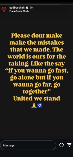 उन्होंने अपने स्टोरी में लिखा कि प्लीज वो गलतियां मत करें जो हम लोगों ने की थी। बादशाह ने आगे लिखा कि अगर आप तेजी से आगे बढ़ना चाहते हैं तो अकेले चले लेकिन अगर आप दूर तक जाना चाहते हैं तो सबके साथ मिलकर चलें। एक साथ रहने में ही शक्ति है।