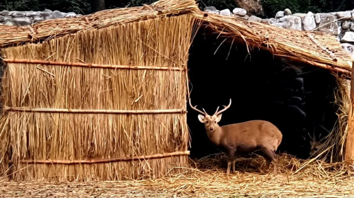 शाकाहारी जानवरों के बाड़ों में अस्थायी झोपड़ियां बनाई गई हैं जिन्हें तारों और रस्सियों से बांधा गया है। इन झोपड़ियों की छतों को काली तिरपाल से ढककर वाटरप्रूफ बनाया गया है। आरामदायक फर्श के लिए पराली और तूड़ी के बिस्तर बिछाए गए हैं ताकि जानवरों को गर्माहट मिल सके।