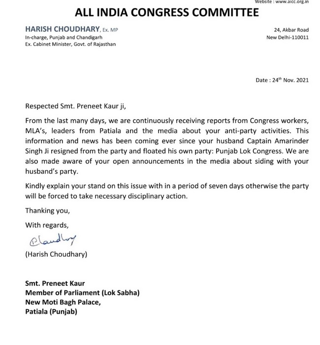 हरीश चौधरी की ओर से जारी किए गए नोटिस में कहा गया है, ‘जब से आपके पति कैप्टन अमरिंदर सिंह ने अपनी पंजाब लोक कांग्रेस पार्टी बनाई है, तब से पार्टी कार्यकर्ताओं, पटियाला के विधायकों व मीडिया रिपोर्टों से जानकारी मिल रही थी की आप पार्टी विरोधी काम कर रही हैं। हमारे पास ऐसी भी सूचनाएं है कि आप अपनी पति की पार्टी की तरफदारी में घोषणाएं कर रही हैं। अत: आप सात दिनों के भीतर अपना स्टैंड स्पष्ट करें। नहीं तो आपके खिलाफ पार्टी अनुशासनात्मक कारर्वाई करेगी।’