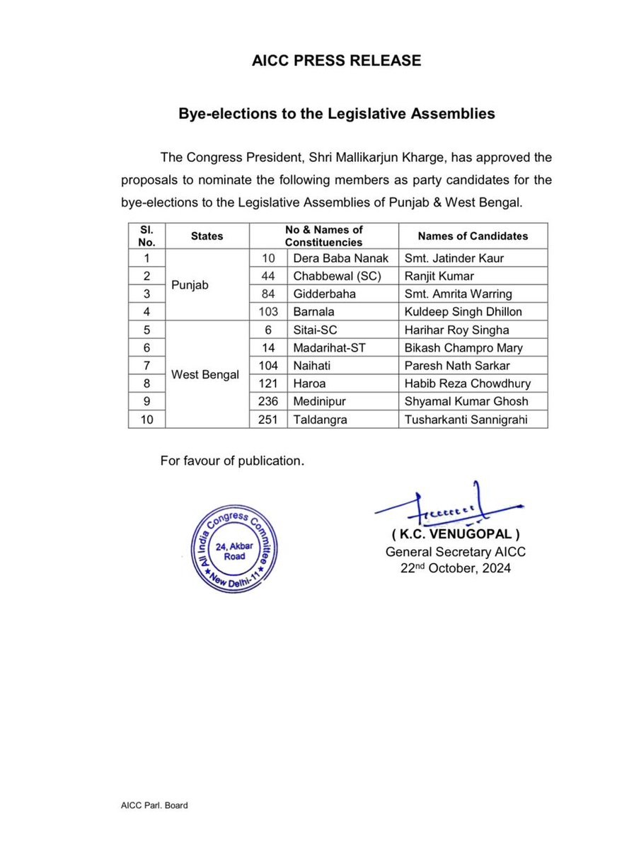 पंजाब विधानसभा उपचुनाव के लिए कांग्रेस ने जारी की प्रत्याशियों की लिस्ट, पढ़ें किसे कहां से मिला टिकट?