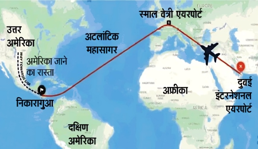 डंकी रूट अपनाने वालों का सफर आमतौर पर पश्चिम एशिया के एयरपोर्ट जैसे दुबई या शारजाह से शुरू होता है। यात्रियों को पहले अजरबैजान या तुर्की जैसे देशों से ले जाया जाता है। अटलांटिक महासागर पार करके ये पनामा पहुंचते हैं। इसके बाद अल सल्वाडोर होते हुए मेक्सिको में दाखिल होते हैं। यात्रा का सबसे खतरनाक हिस्सा अटलांटिक को पार करने के बाद शुरू होता है।