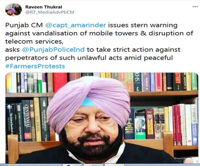मुख्यमंत्री के मीडिया रवीन ठुकराल ने ट्वीट कर कहा है कि मुख्यमंत्री कैप्टन अमरिंदर सिंह ने माेबाइल टावरों को नुकसान पहुंचाने और टेलीकाम सेवाओं को बाधित करने वालों को कड़ी चेतावनी दी है। मुख्यमंत्री कैप्टन अमरिंदर सिंह ने पुलिस को ऐसे तत्वों के खिलाफ कड़ी कार्रवाई करने का आदेश दिया है।