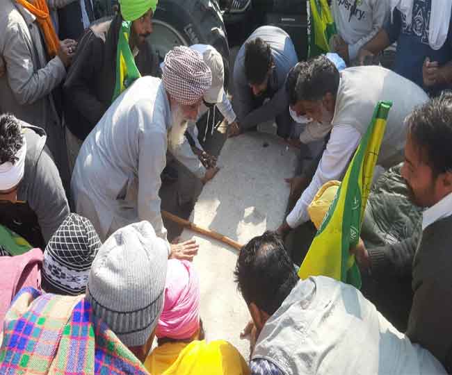 डूमवाली बार्डर पर सड़क पर डाले गए अवरोधक को हटाते पंजाब के किसान।