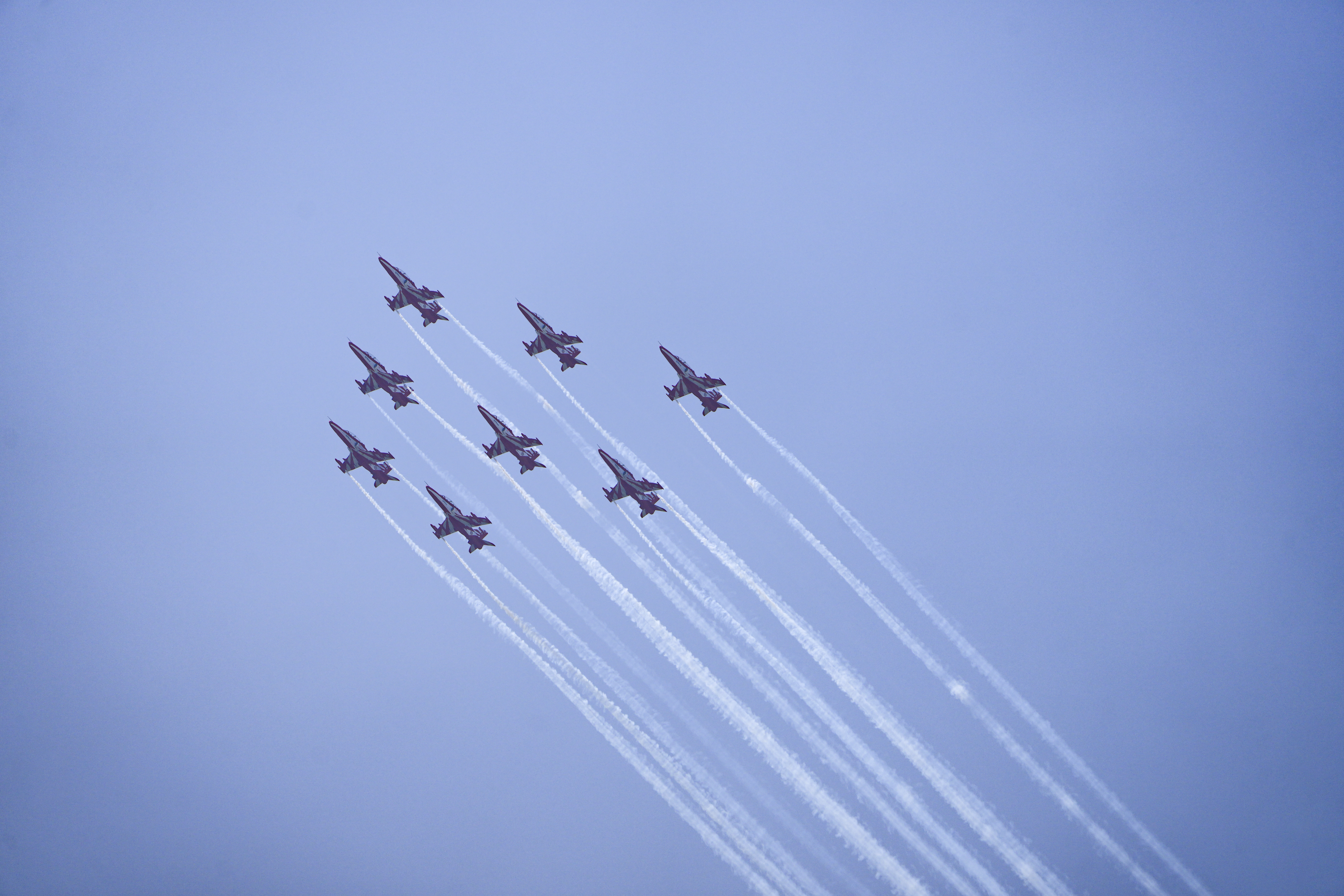 फोटो: रूसी मूल के लड़ाकू विमानों के परिचालन के समापन समारोह के दौरान तीन मिग-21 विमान विक फॉर्मेशन में उड़ान भरते हुए।