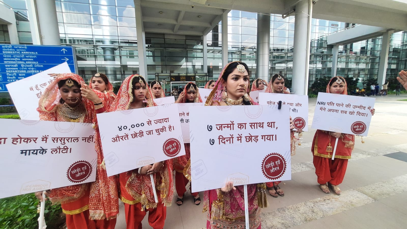 लखवंत सिंह , मोहाली। मोहाली एयरपोर्ट पर कई दुल्हन के रूप में सजी महिलाएं हाथों में बैनर लिए खड़ी नजर आईं। पतियों के अत्याचार से बदला लेने के लिए पतियों की खोज कर रही थी। इस दौरान पता चला कि यह एक टीवी सीरियल की शूटिंग की जा रही है।