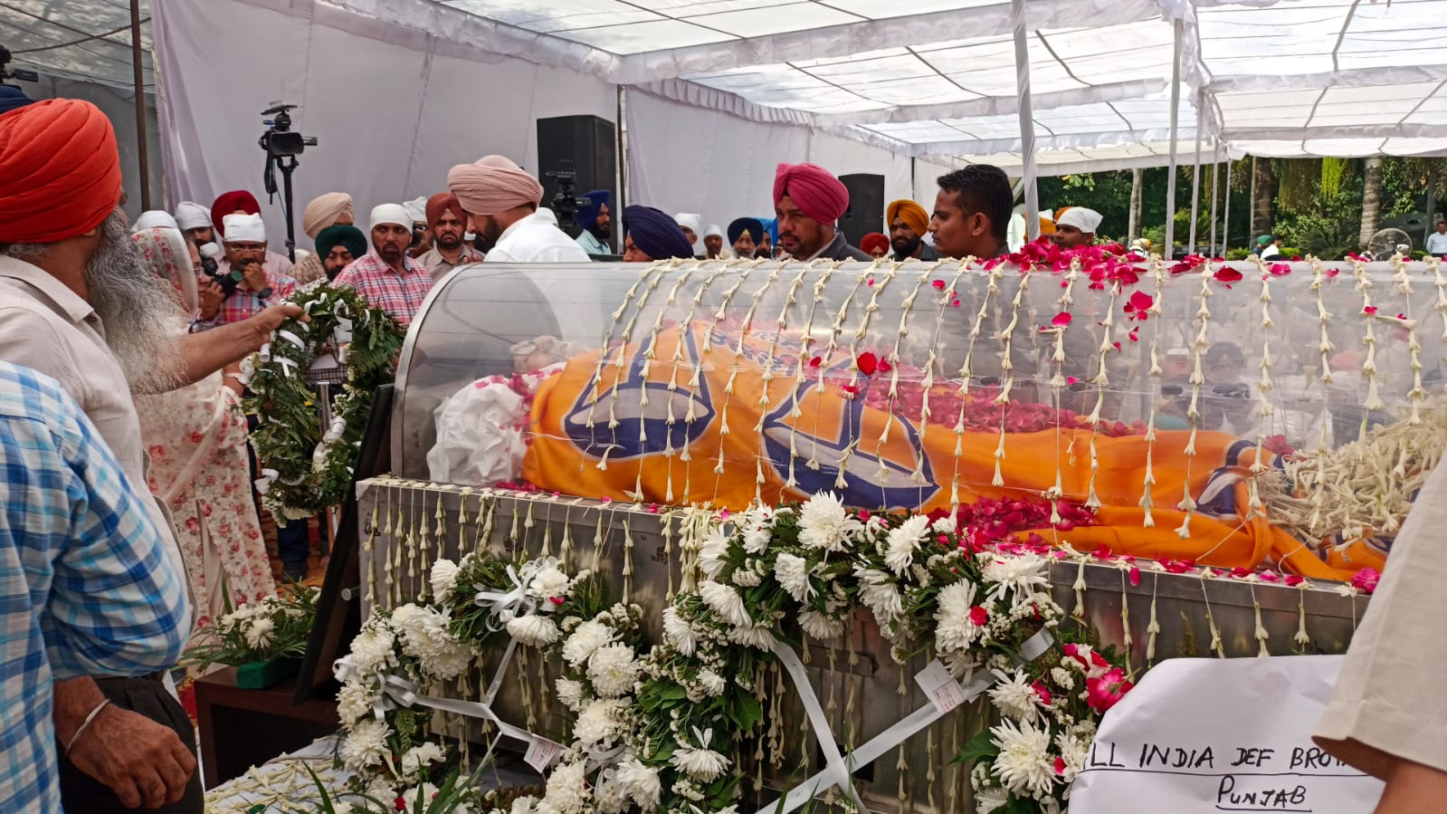 VIDEO | The mortal remains of former Punjab CM Parkash Singh Badal have been kept at Shiromani Akali Dal party office in Chandigarh for people to pay homage to the departed soul. pic.twitter.com/Mo1YxiphzA