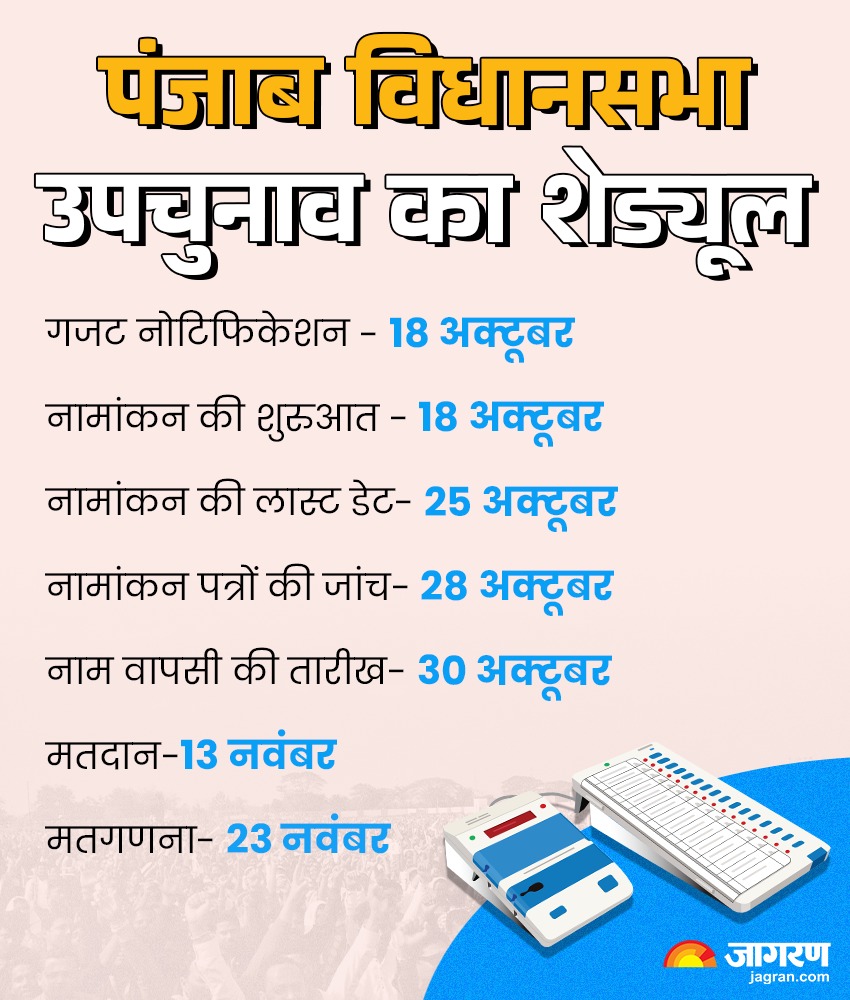 उपचुनाव का विवरण देते हुए पंजाब के मुख्य चुनाव अधिकारी सिबिन सी ने कहा कि इन उपचुनावों के लिए जारी कार्यक्रम के अनुसार, अधिसूचना 18 अक्टूबर को जारी की जाएगी। नामांकन दाखिल करने की अंतिम तिथि 25 अक्टूबर है और नामांकन पत्रों की जांच 28 अक्टूबर को की जाएगी, जबकि उम्मीदवारी वापस लेने की अंतिम तिथि 30 अक्टूबर है। सिबिन सी ने कहा कि मतदान 13 नवंबर को होगा और परिणाम 23 नवंबर को घोषित किए जाएंगे।