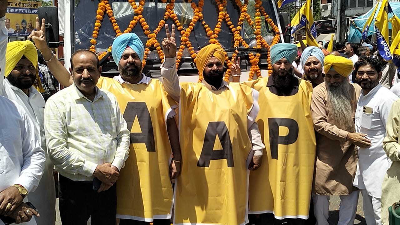 आम आदमी पार्टी के समर्थक पीले कपड़े पहने नजर आ रहे हैं। उनके कपड़ों पर आप लिखा है। वहीं विधायक रमन अरोड़ा आप का झंडा फहराते हुए दिखाई दिए।