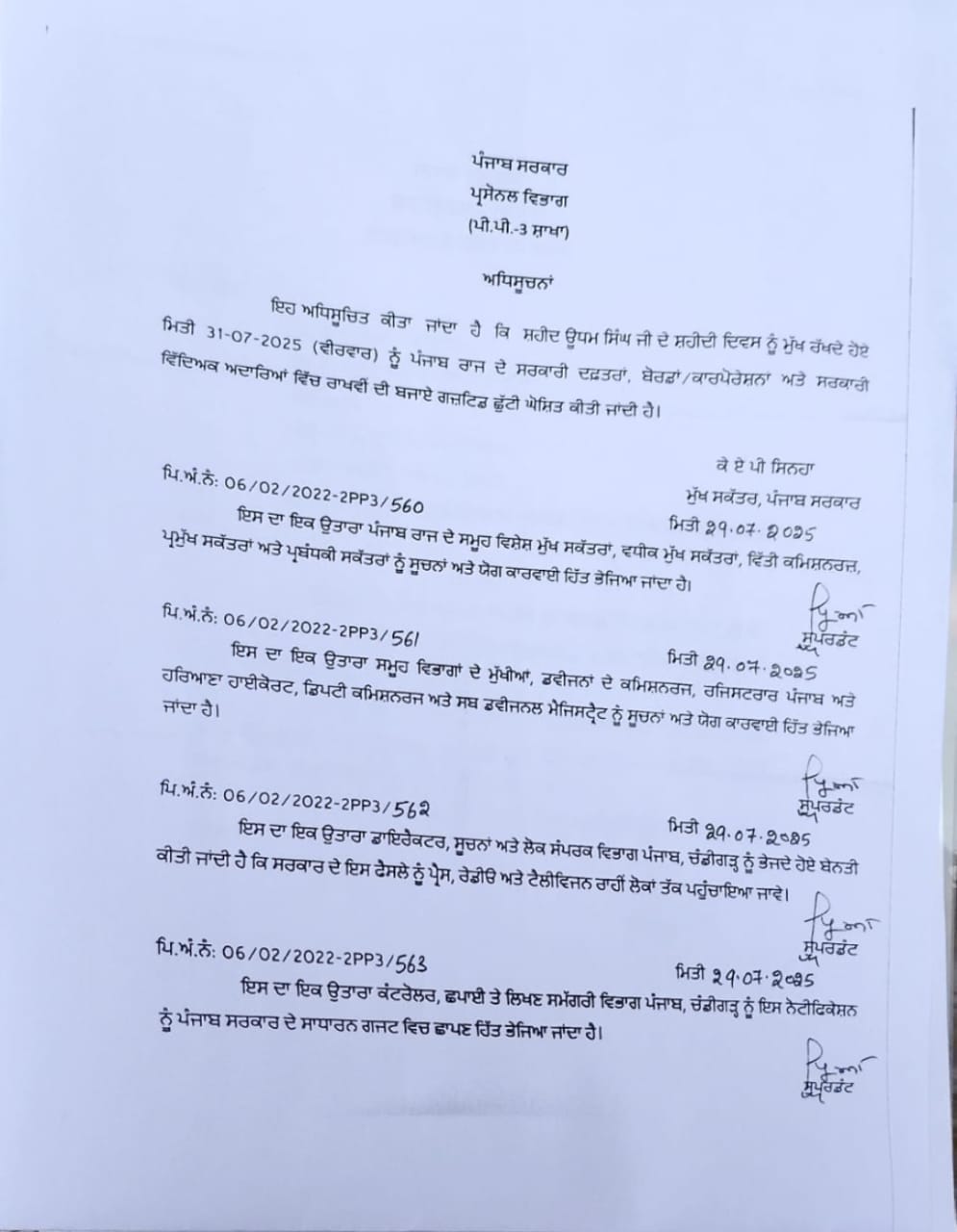गौरतलब है कि पंजाब सरकार द्वारा जारी वर्ष 2025 के सरकारी अवकाश कैलेंडर में 31 जुलाई की इस छुट्टी को पहले आरक्षित छुट्टियों में जगह दी गई थी, जिसे अब सरकारी अवकाश घोषित कर दिया गया है और इसकी अधिसूचना भी जारी कर दी गई है।