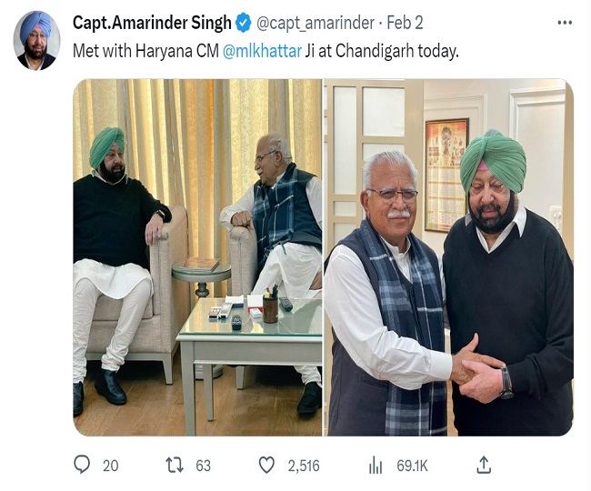 हरियाणा के मुख्यमंत्री मनोहर लाल ने कैप्टन के साथ अपनी फोटो ट्वीटर पर साझा की और लिखा कि कैप्टन से गुफ्तगू... सौहार्दपूर्ण भेंट के दौरान अनेक महत्वपूर्ण विषयों पर चर्चा हुई है। बताया जाता है कि पंजाब के राज्यपाल बनवारी लाल पुरोहित और हरियाणा के मुख्यमंत्री मनोहर लाल के बीच विभिन्न अंतरराज्यीय मसलों पर विस्तार से चर्चा हुई। दोनों राज्यों के बीच कई मुद्दों पर अक्सर तनातनी रहती है।