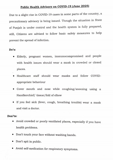 देश के कुछ हिस्सों में कोविड-19 मामलों में बढ़ोतरी देखी जा रही है। ऐसे में पंजाब के लोगों के लिए एहतियाती सलाह जारी की जाती है। हालांकि, पंजाब राज्य की स्थिति नियंत्रण में है और स्वास्थ्य व्यवस्था पूरी तरह से तैयार है लेकिन फिर भी नागरिकों को संक्रमण को को रोकने के लिए कुछ बुनियादी सुरक्षा उपायों का पालन करने की सलाह दी जाती है।