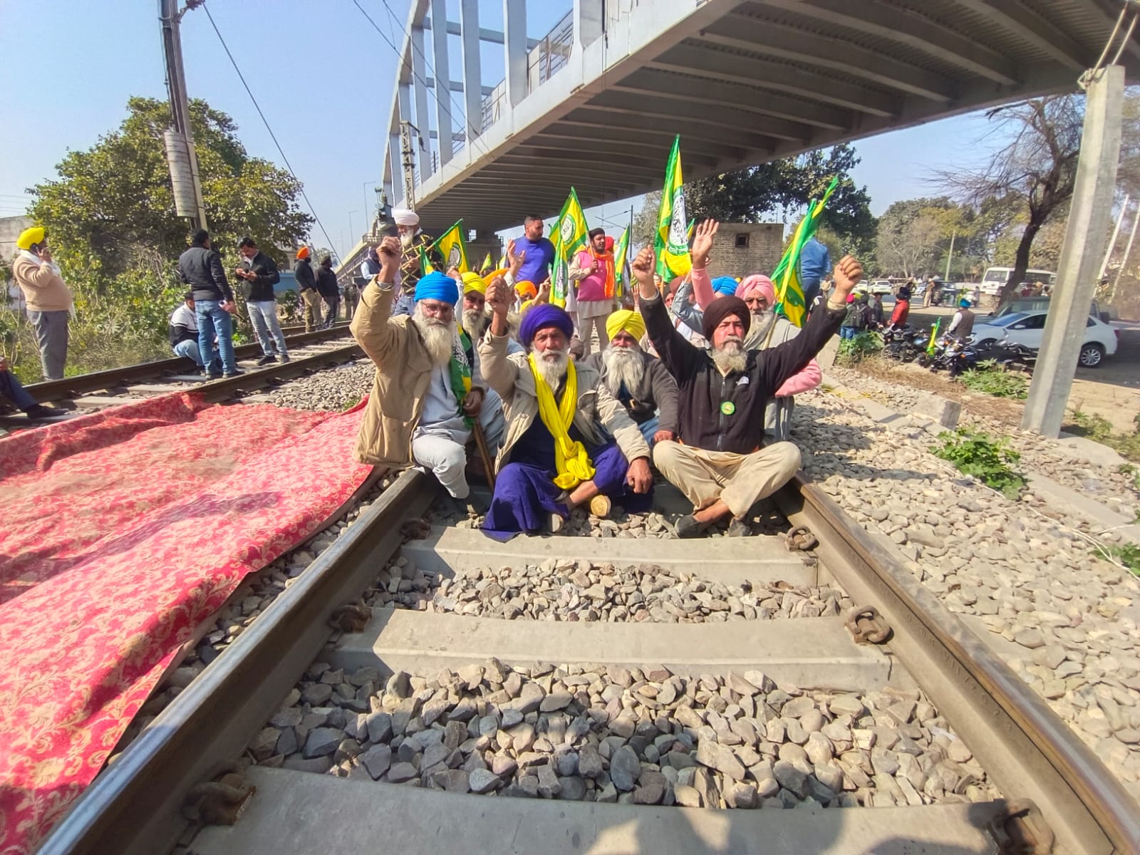 बठिंडा बरनाला रेलवे लाइन पर गांव जेठू में धरना लगाकर प्रदर्शन करते हुए किसान।