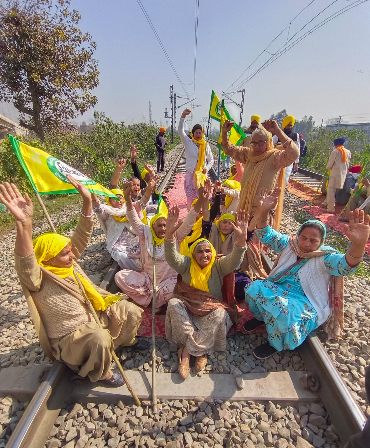 वल्ला रेलवे फाटक पर अमृतसर दिल्ली रेल ट्रैक जाम कर अपनी मांगों को लेकर प्रदर्शन करते हुए भारती किसान यूनियन उगराहां की महिला सदस्य।