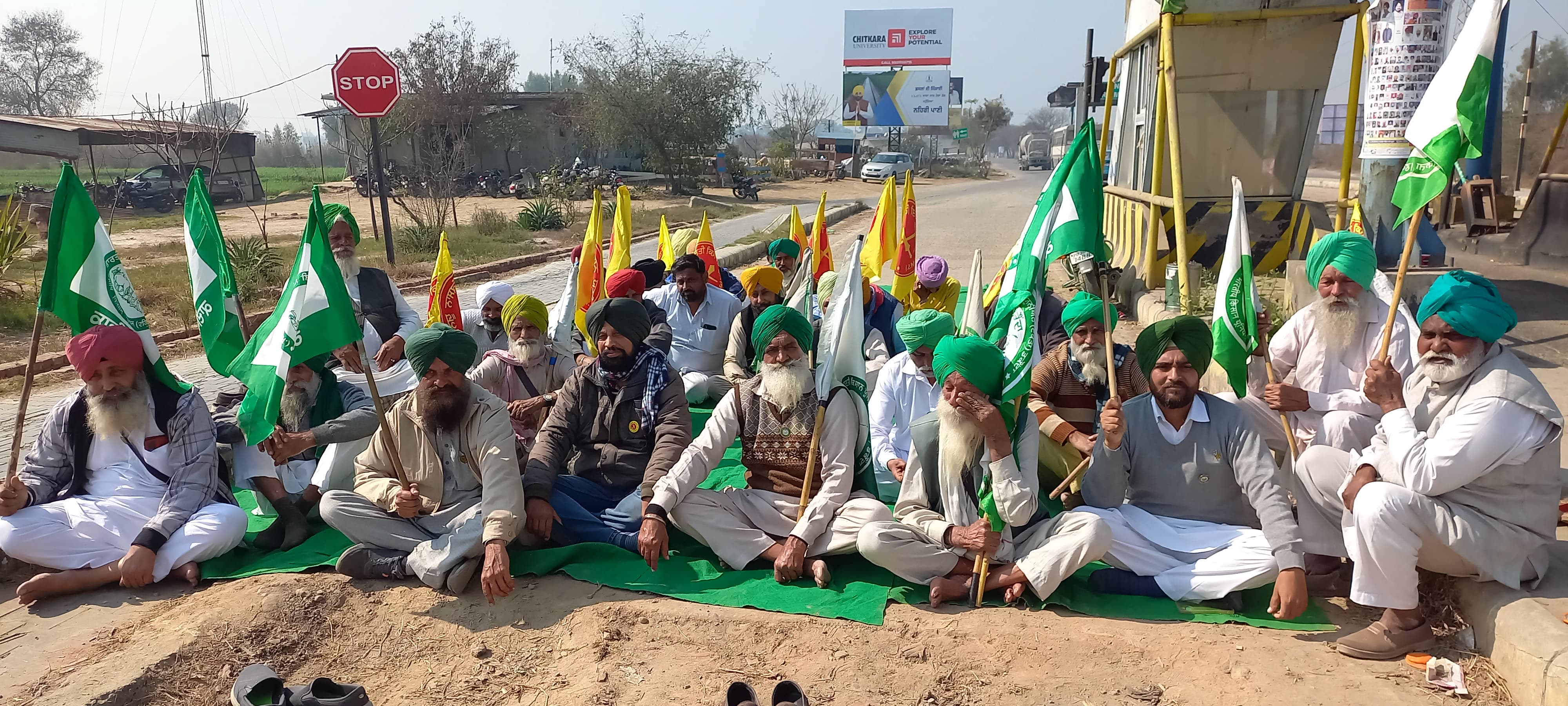 बठिंडा चंडीगढ़ रोड पर गांव लहरा बेगा के टोल प्लाजा पर धरना लगाकर प्रदर्शन करते हुए किसान।