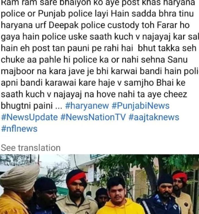 उधर गैंगस्टर लारेंस बिश्नोई गैंग के नाम पर इंटरनेट मीडिया पर एक पोस्ट डाली गई है। इसमें पुलिस को धमकी दी गई है। पोस्ट में लिखा है- '' राम राम सारे भाइयों को। यह पोस्ट खास हरियाणा व पंजाब पुलिस के लिए है। हमारा भाई टीनू हरियाणा उर्फ दीपक पुलिस कस्टडी सेफरार हो गया है। पुलिस उसके साथ कुछ भी नाजायज कर सकती है। यह पोस्ट इसलिए डालनी पड़ रही है कि बहुत धक्का सह चुके हैं पहले ही पुलिस का, अब और नहीं सहना। हमें मजबूर न किया जाए, जाे भी कार्रवाई बनती है पुलिस अपनी कार्रवाई कर ले। हमारी मजबूरी भी समझो , भाई के साथ कुछ भी नाजायज न हो। नहीं हो इसके लिए भुगतनी पड़ेगी।