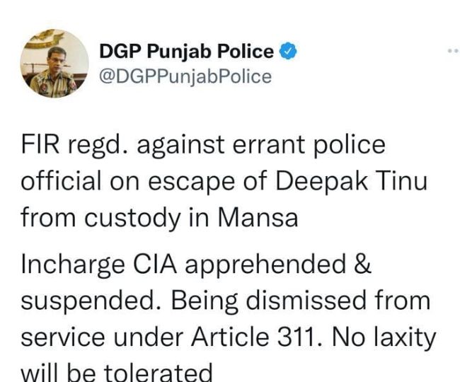 दूसरी ओर, पंजाब के डीजीपी गौरव यादव ने कहा कि इस मामले में दीपक टीनू को ला रहे सीआइए के मानसा प्रभारी के खिलाफ एफआइआर दर्ज कर ली गई है। अधिकारी को निलंबित कर दिया गया है और उसे गिरफ्तार कर लिया गया है।पुलिस टीम फरार दीपक टीनू की दोबारा पकड़ने के लिए पुलिस टीमें अभियान चला रहा है।