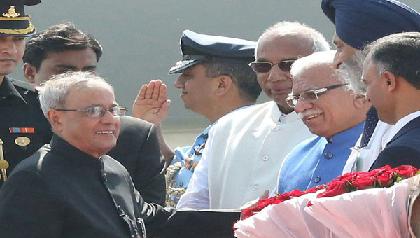 राष्ट्रपति का स्वागत करते राज्यपाल कप्तान सिंह सोलंकी व हरियाणा के मुख्यमंत्री मनोहरलाल।