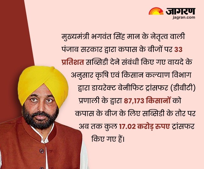मुख्यमंत्री भगवंत सिंह मान की सरकार ने 87,173 नरमा कास्तकारों के बैंक खातों में 17 करोड़ से अधिक की सब्सिडी डाली है। अहम बात यह है कि पिछले दो बार से फसल खराब होने की वजह से परेशान चल रहे कपास किसानों की मदद के लिए मुख्यमंत्री भगवंत सिंह मान खुद आगे आए। पंजाब सरकार ने कपास किसानों को बीज के लिए न सिर्फ सब्सिडी दी बल्कि कपास की खेती के लिए नहरी पानी की सप्लाई दी। क्योंकि कपास किसानों ने मुख्यमंत्री को बताया था कि अगर पहली अप्रैल से उन्हें सिंचाई के लिए नहरी पानी मिल जाए तो पौधों को तमाम प्रकार की बीमारियों से बचाया जा सकता है। जिसे मुख्यमंत्री ने करके दिखाया।