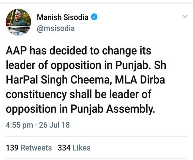 बता दें कि वीरवार को पार्टी के प्रदेश प्रभारी मनीष सिसोदिया ने ट्वीट कर कहा था कि खैहरा को नेता विपक्ष के पद से हटा दिया गया है और उनकी जगह हरपाल सिंह चीमा आप विधायक दल व पंजाब विधानसभा में नेता विपक्ष होंगे। दूसरी ओर, आप के वरिष्ठ नेता कंवर संधू ने ट्वीट कर चीमा को अाप विधायक दल का नेता बनाए जाने पर बधाई दी है। इसके साथ ही कंवर संधू ने तुरंत प्रभाव से आप विधायक दल के प्रवक्ता पद को छोड़ने की इच्छा जताई है।